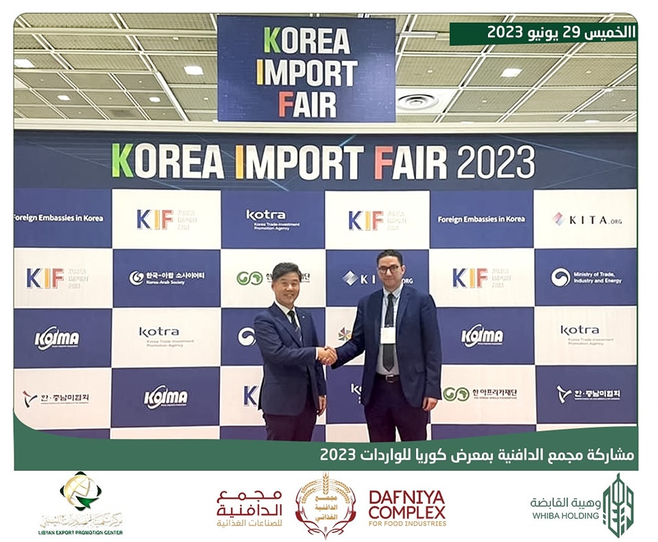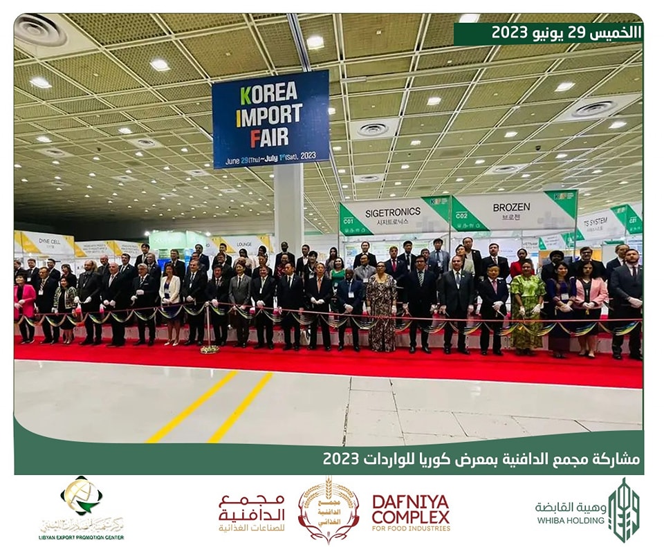 Aldafniya Food Manufacturing Complex, one of the industrial subsidiaries of Wahiba Holding Group, participated in the Korea Import Fair 2023 as part of the Libyan delegation organized by the Libyan Export Development Center, with the presence of the Libyan Ministry of Economy and Trade, the Korean Ministry of Economy, and the Korean Suppliers Association.