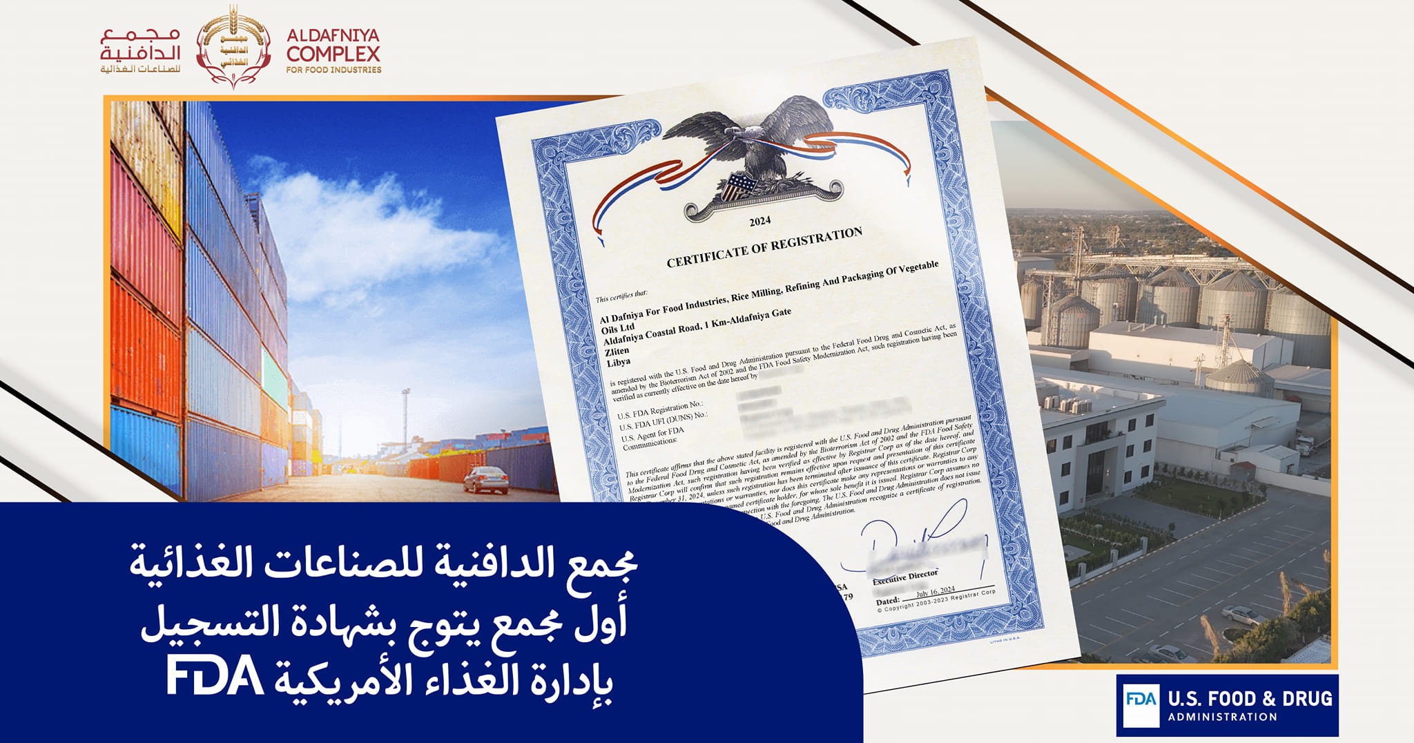 Aldafniya Food Industries Complex becomes the first industrial complex in Libya to receive FDA registration, reaffirming its commitment to global quality standards and paving the way to enter U.S. and Canadian markets.